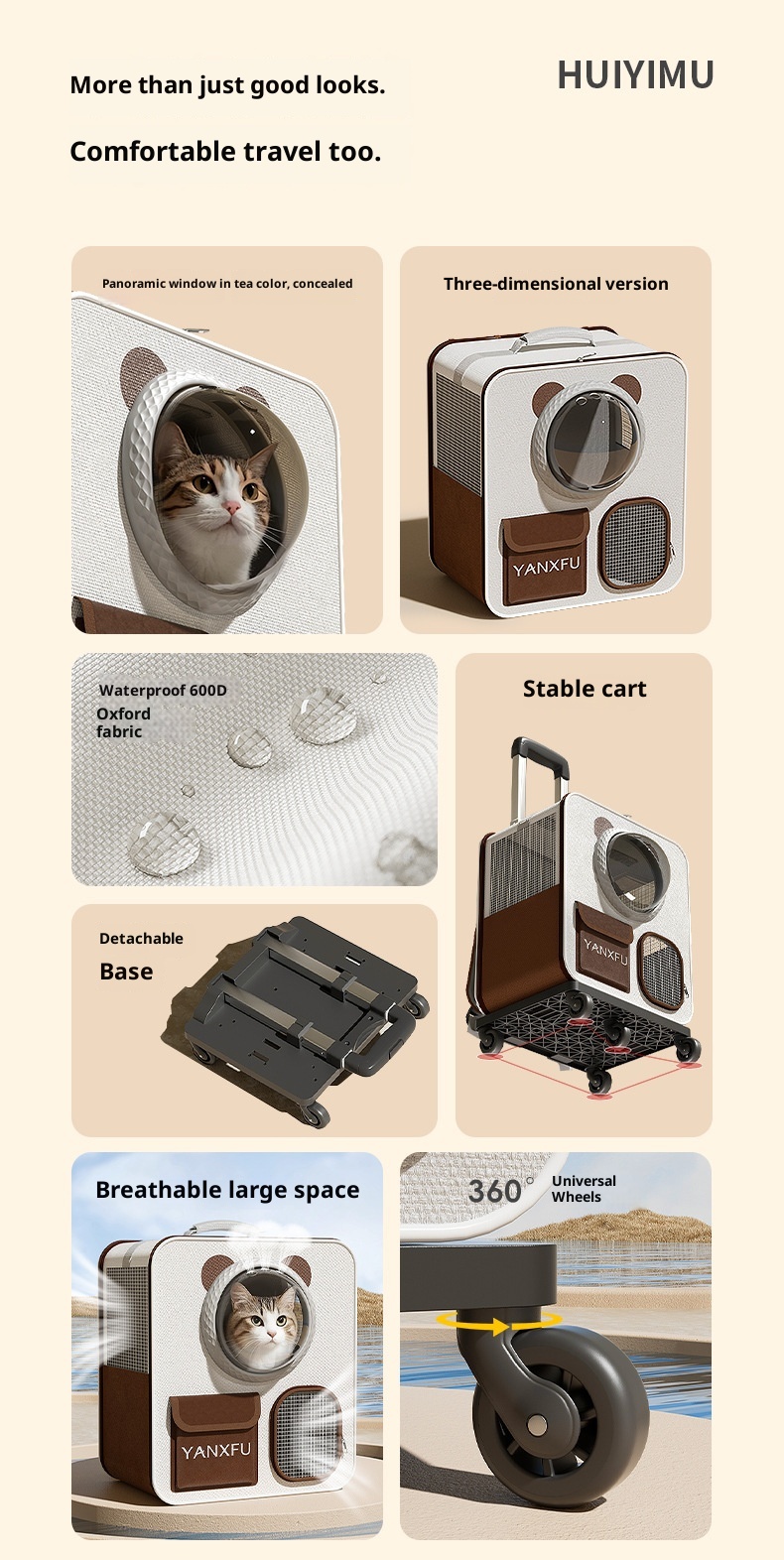 全景式有色玻璃窗确保宠物在旅途中保持私密性,同时又能让他们保持平静和好奇。配备减震静音PU轮和可拆卸底座,确保稳定性,可在任何表面上顺畅滑动。